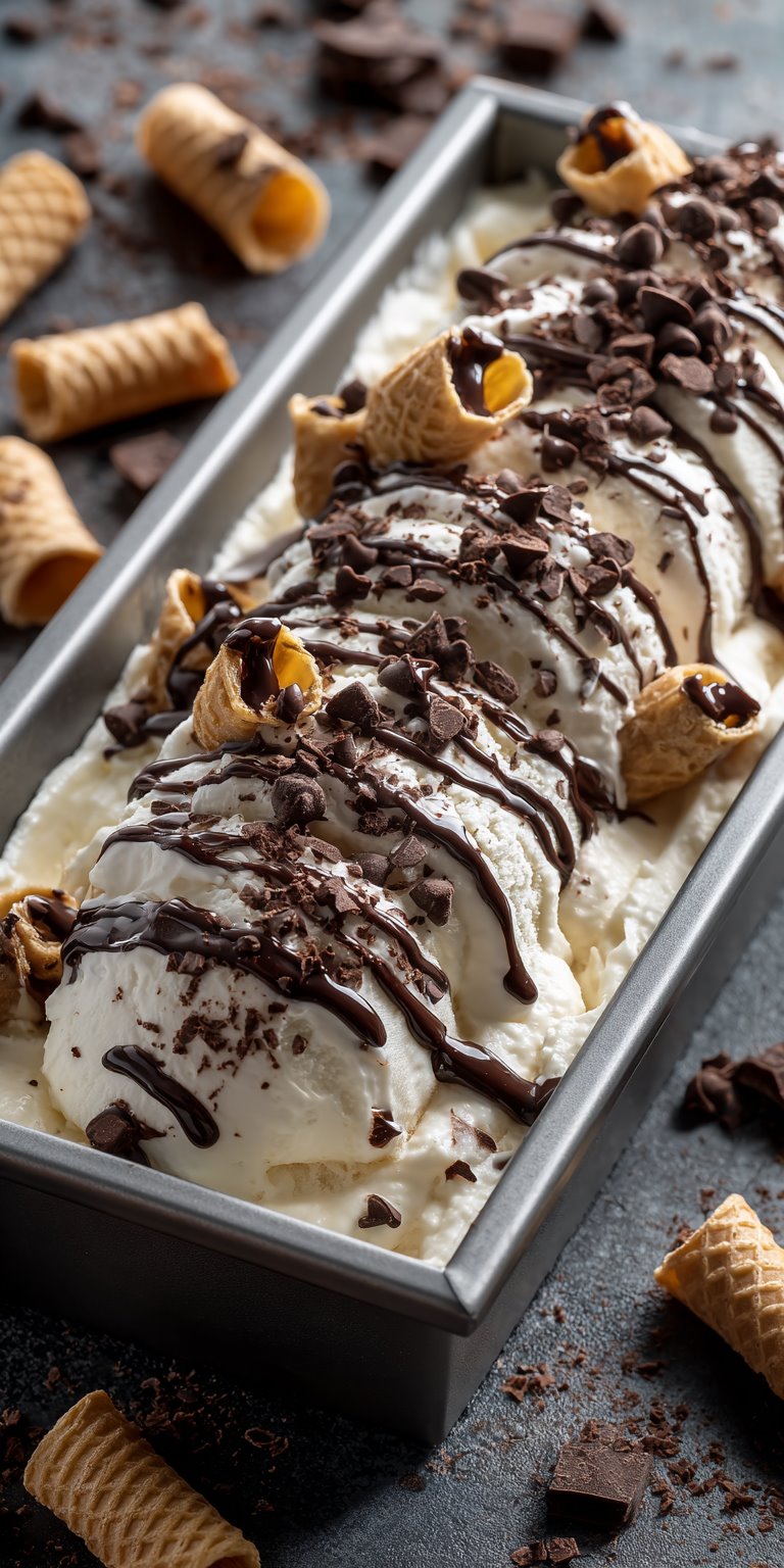 This cannoli ice cream combines creamy ricotta, chocolate-coated shell pieces, and mini chips for a frozen treat that feels indulgent and refreshing.