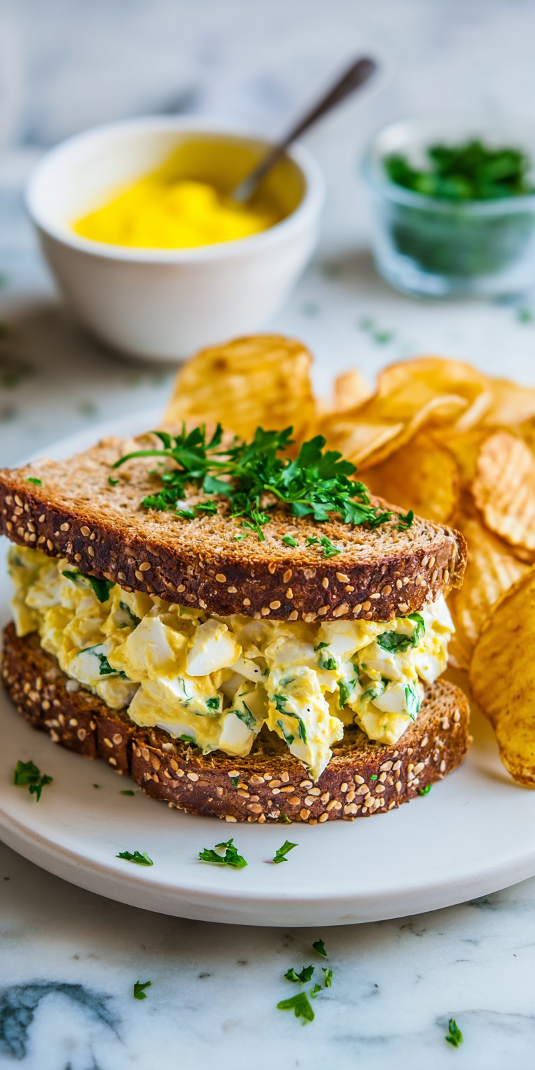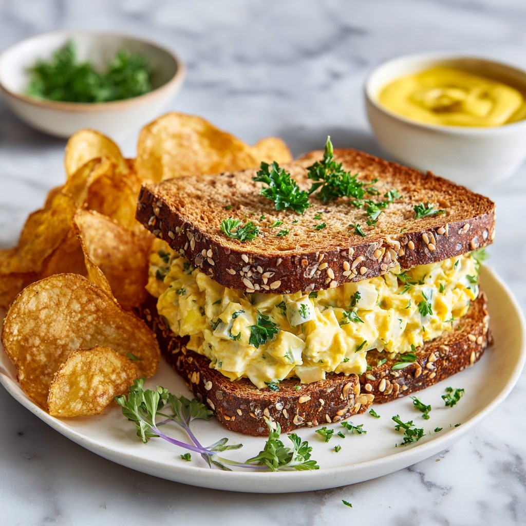 Serve your egg salad sandwich with a side of potato chips or crispy fries for a classic lunch combo.
