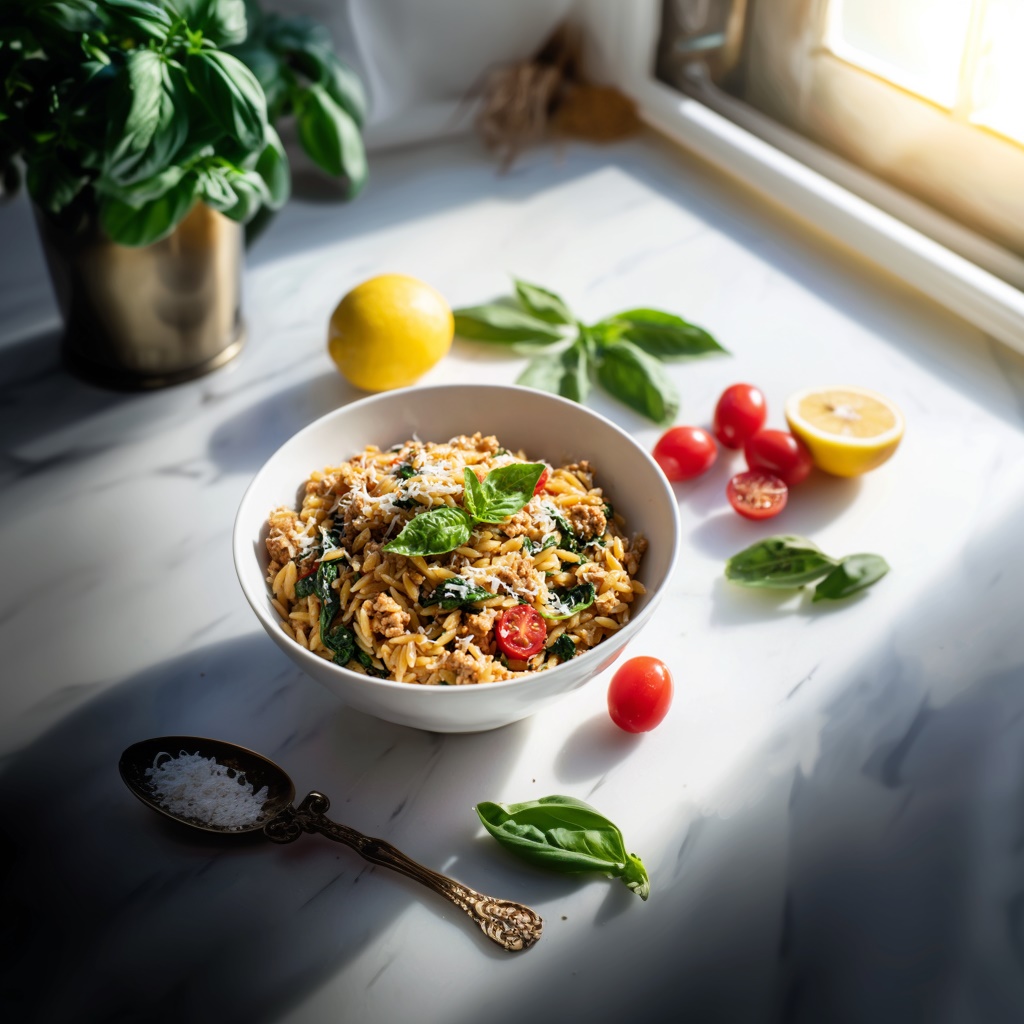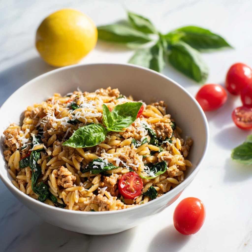 It’s packed with lean protein, tender orzo pasta, and a flavorful tomato-based sauce, all cooked together in a single pan for easy cleanup.
