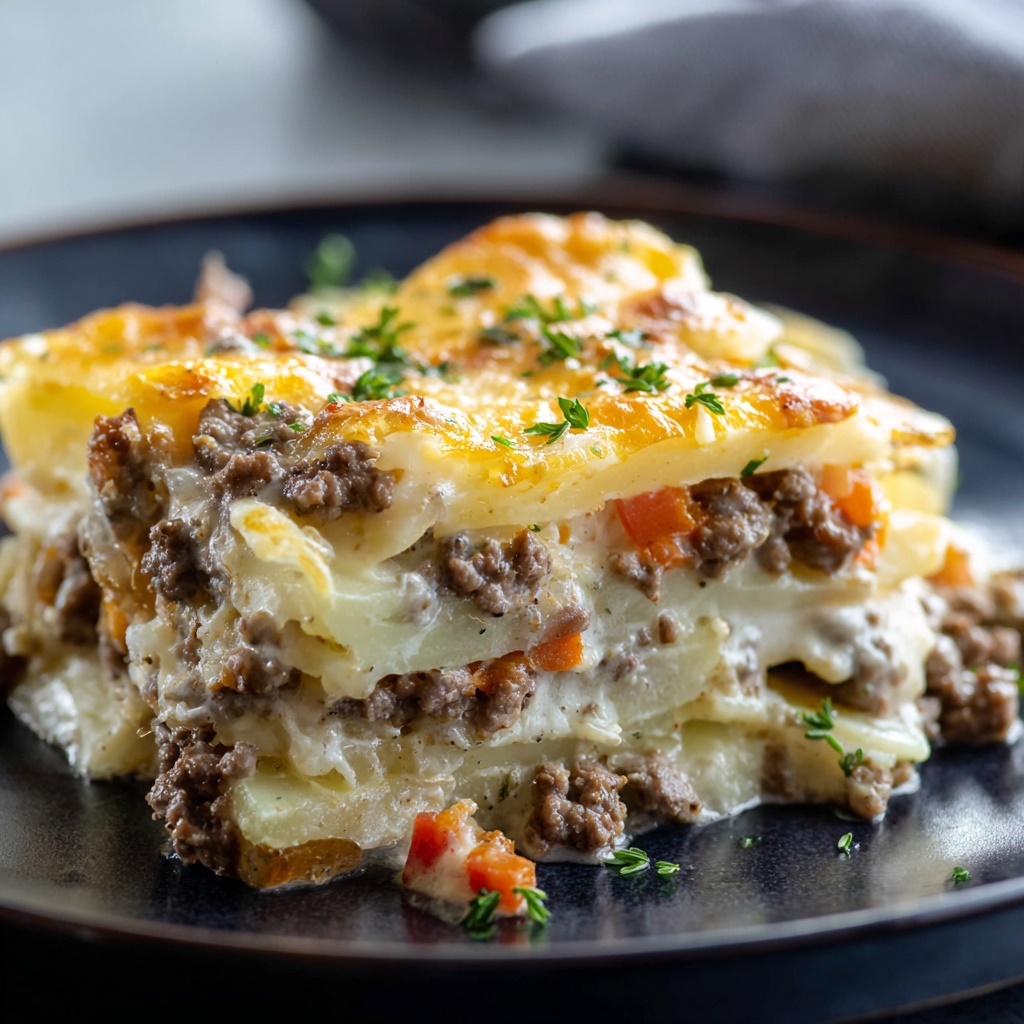 The layers of potatoes, beef, and creamy sauce make it hearty and satisfying.