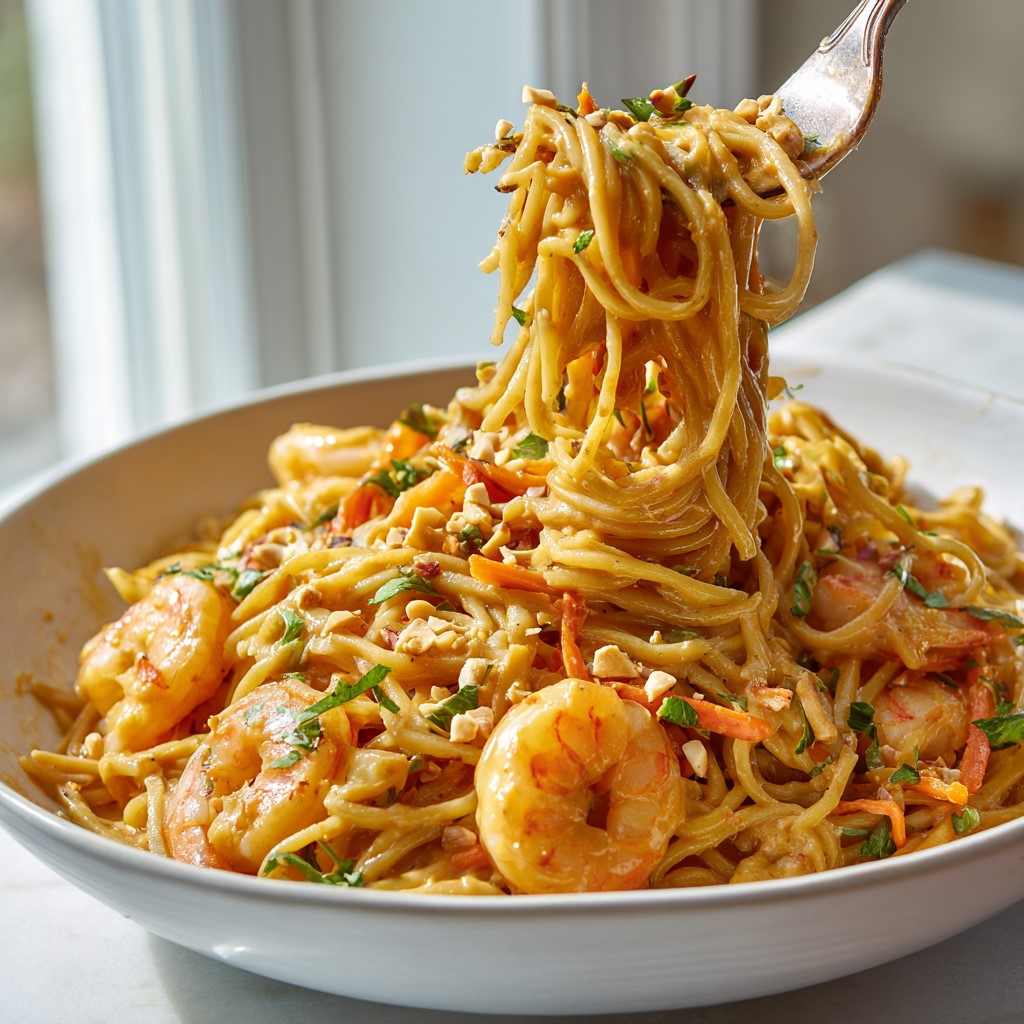 They combine tender shrimp, chilled noodles, crisp spiralized vegetables, bright herbs, and a creamy peanut sauce for an easy weeknight meal that still feels special.