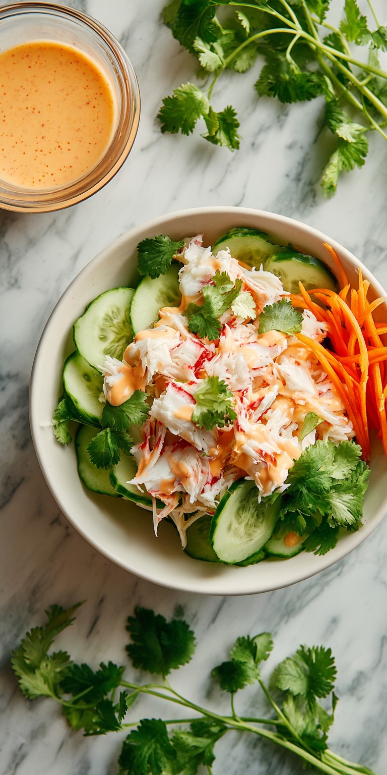 The imitation crab adds a light seafood flavor that pairs beautifully with crisp cucumber and carrots.