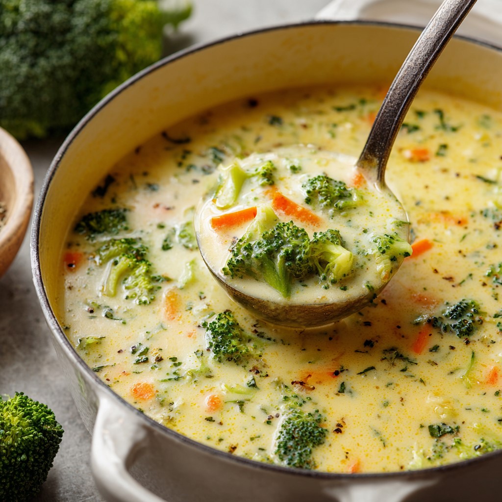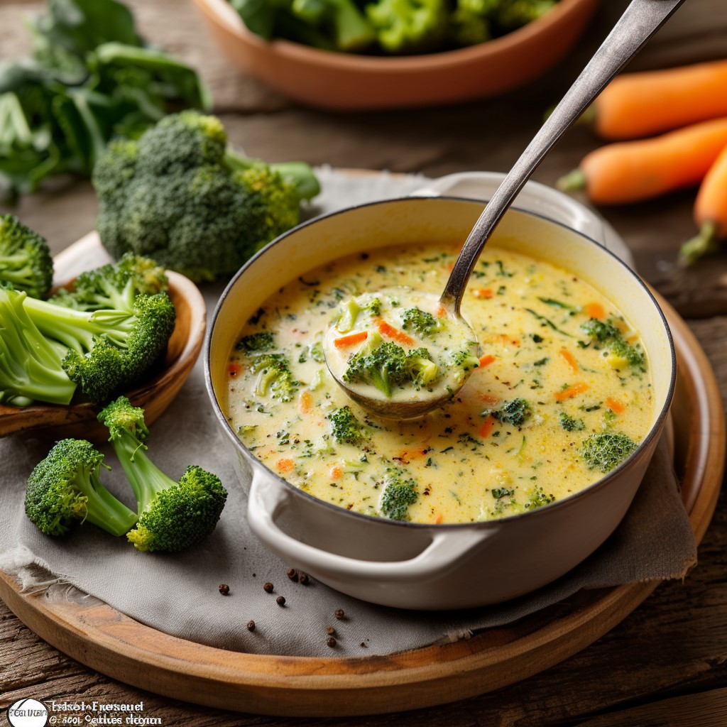 This recipe is creamy, hearty, and full of fresh flavors from broccoli, carrots, onion, and cheese.